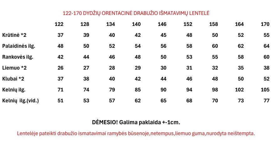 Drabužių išmatavimai nurodyti ramybės būsenoje.